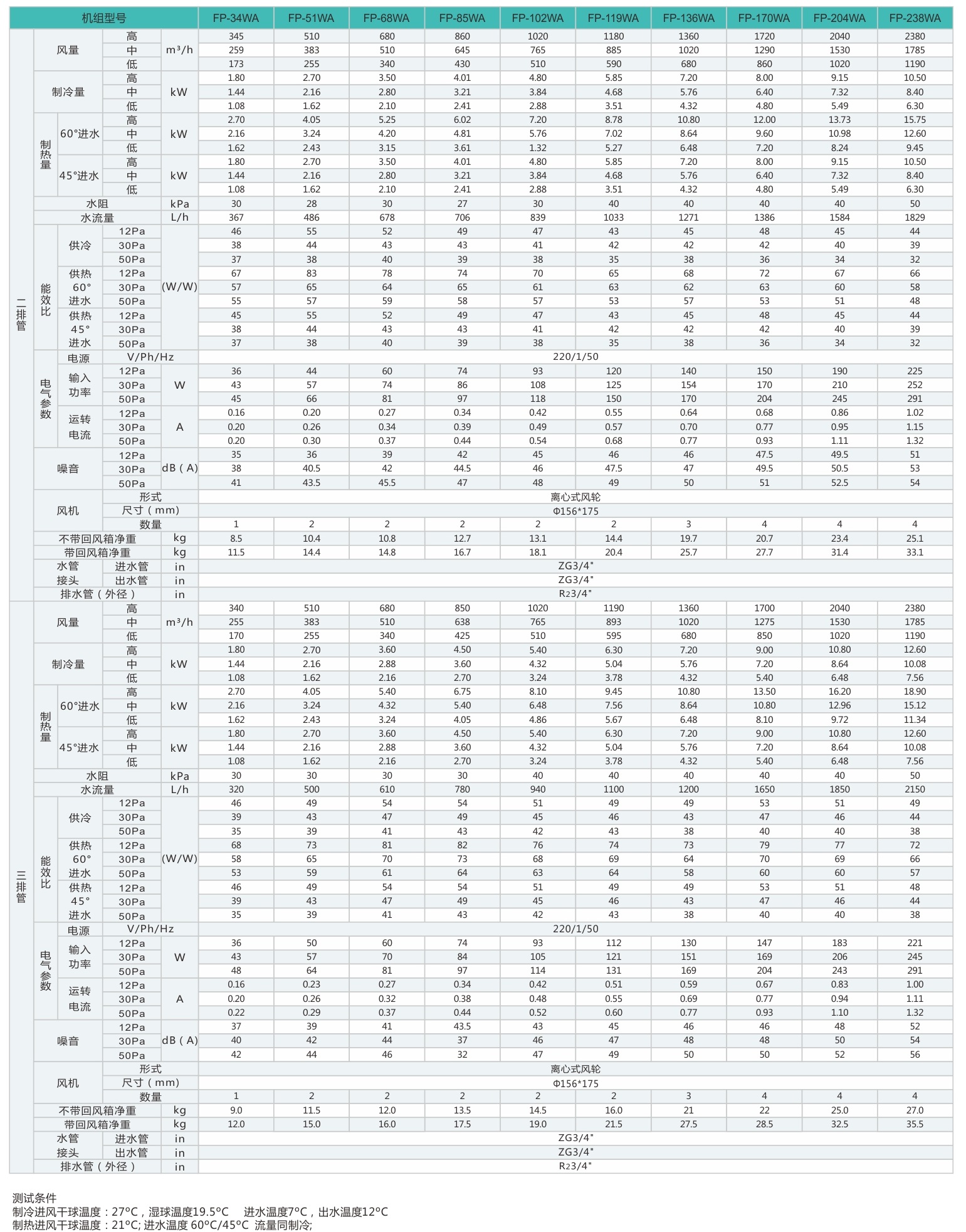 供冷量是在進(jìn)風(fēng)干球溫度27℃,濕度溫度19.5℃,進(jìn)水溫度7℃,出水溫度12℃條件下測試所得。